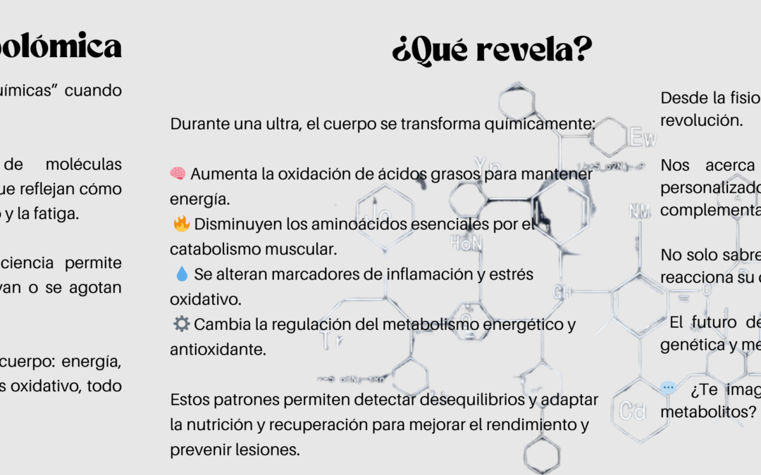 La metabolómica —el estudio de los metabolitos que produce tu organismo— permite entender qué ocurre dentro cuando corres durante horas, cómo utilizas la energía, cuándo aparece el estrés oxidativo y cómo responde tu metabolismo a la fatiga extrema.